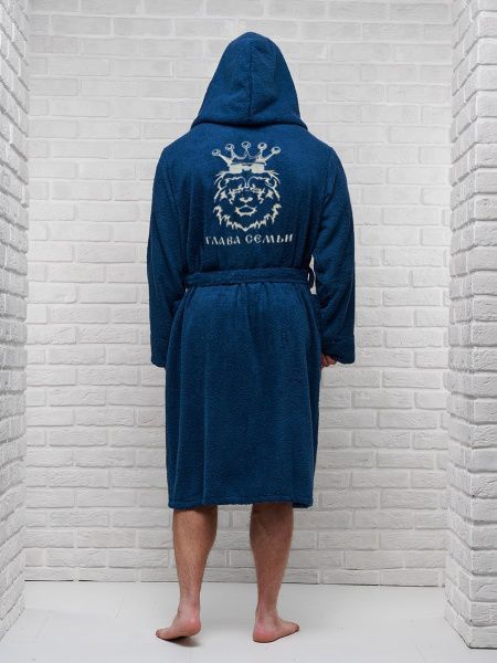 Халат махровый с капюшоном, темно-синий с вышивкой