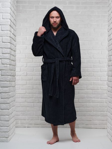 Халат мужской махровый PandaHug с капюшоном, черный