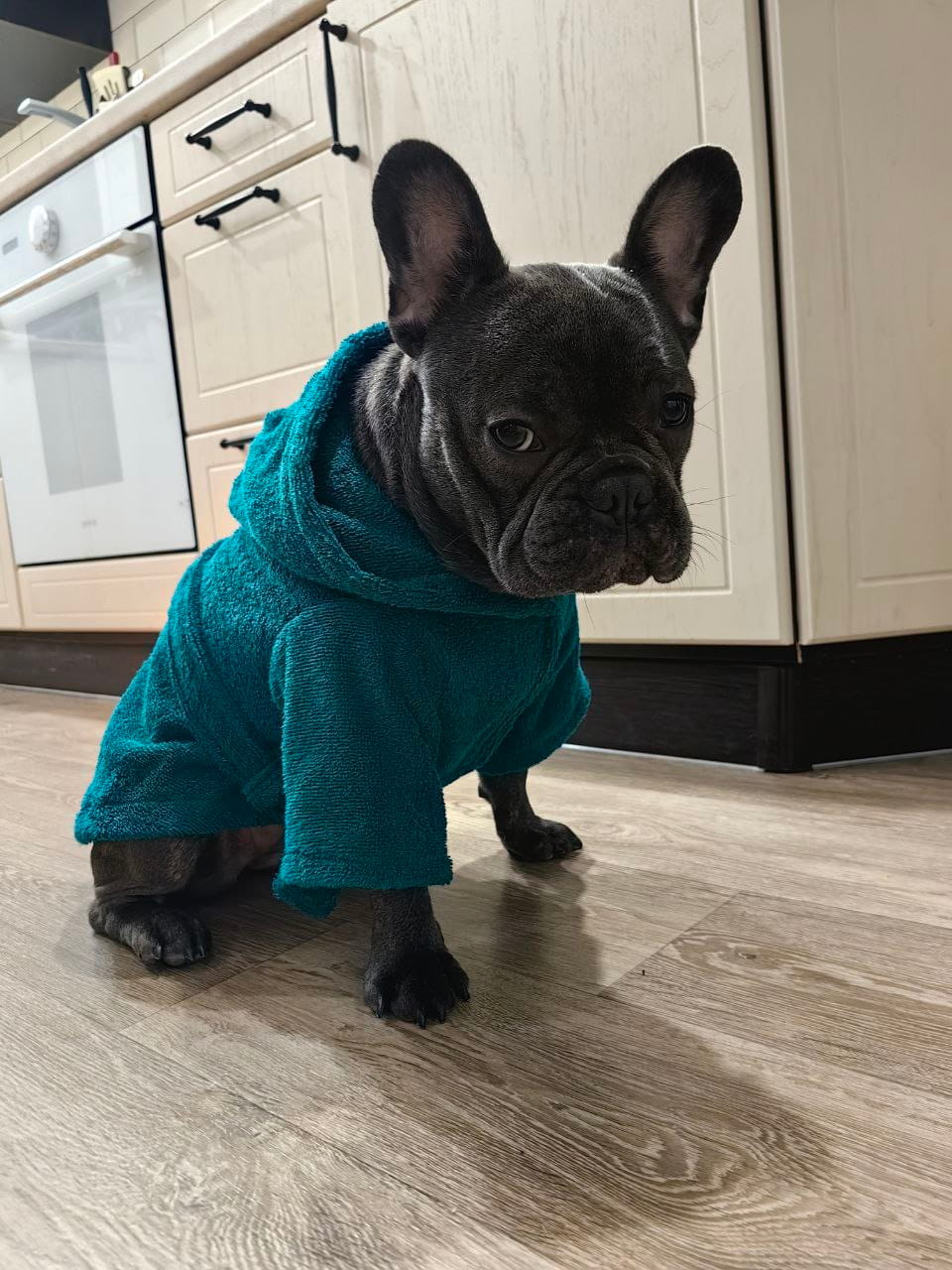 Материал: Натуральный хлопок (махровое полотно). Плотность 380-400 г/м² обеспечивает оптимальную впитываемость и воздухопроницаемость. Халат мягко согревает, не давая собаке замерзнуть, и при этом позволяет коже дышать.
