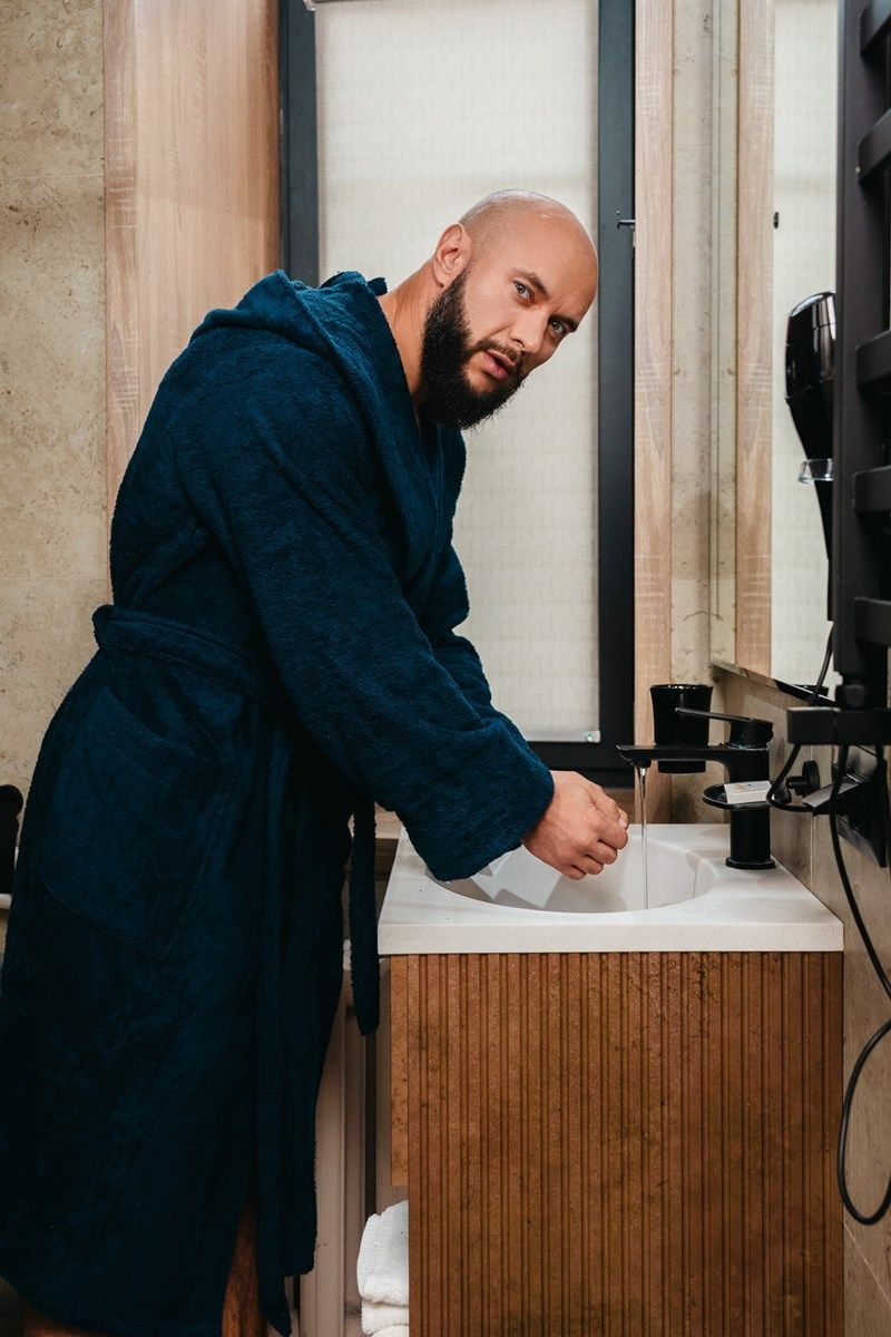 Модель халата с поясом позволяет ему быть универсальным и подходит к любому типу телосложения, скрывая недостатки и подчеркивая достоинства фигуры. Наличие карманов делает его практичным для ношения дома, в бане или сауне, а также на отдыхе.