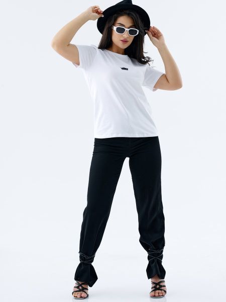 Белая футболка с принтом — незаменимая составляющая базового женского гардероба. Носите ее на выпуск или под заправку, сочетайте с брюками, джинсами и юбками, надевайте под пиджак или жакет. Она универсальна!